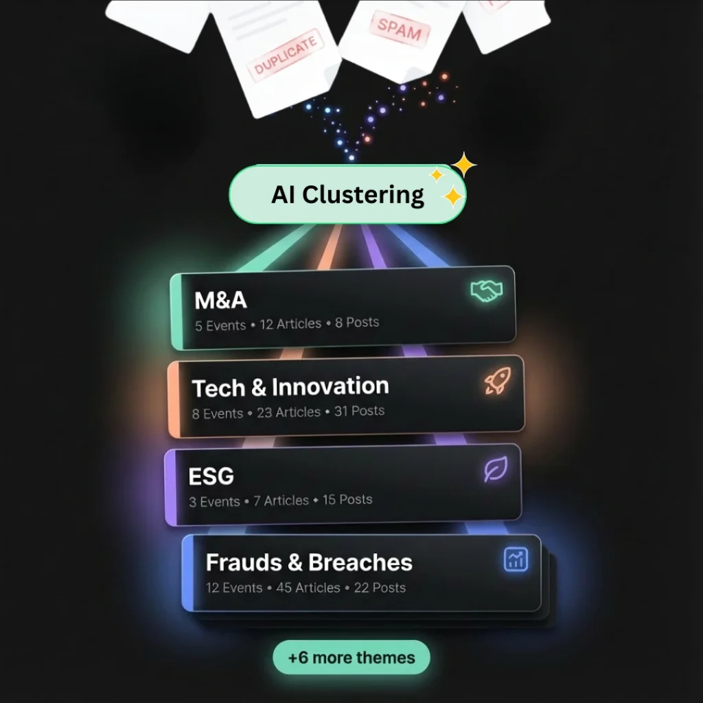 One key announcement generates 100s articles across outlets. AI Event Clustering groups them into a single Key Event auto-sorted by theme (M&A, ESG, Crisis, Leadership).