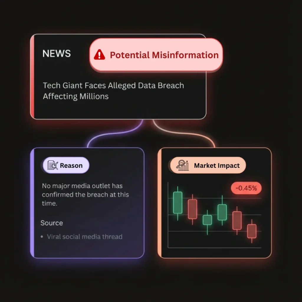 - AI-powered Misinformation Detection (SEBI-compliant), Impactful Events with Market Correlation, Real-Time Alerts, AI-driven Analytics and Automated Reports, Actionable Insights