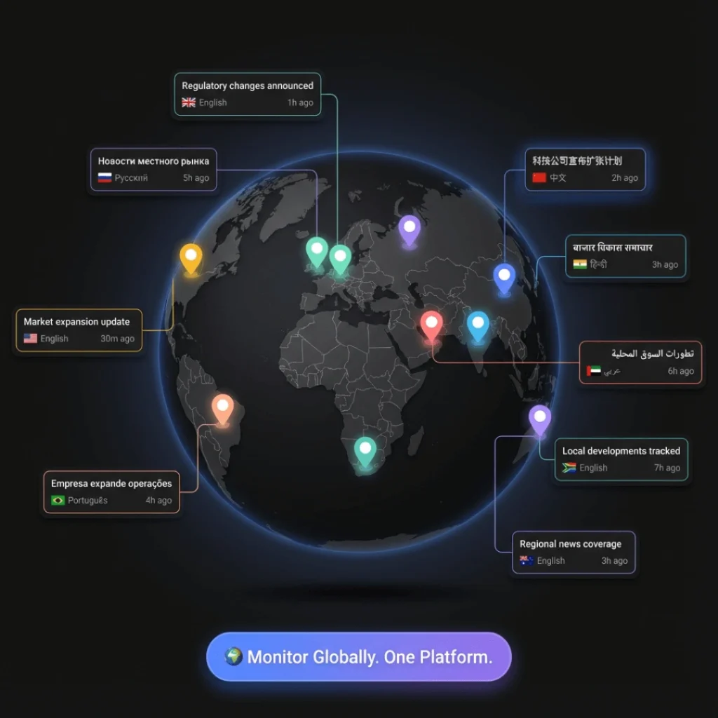 Track regulatory changes, geopolitical events, and local news across every market you operate in. Track coverage across languages and regions - essential for companies with worldwide operations.